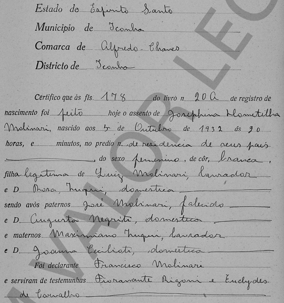- Josephina Dometilha Molinari (05/10/1932, às 20 horas, em Iconha-ES)