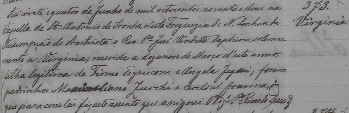 - Virginea, nascida no dia 19/03/1892, batizada no dia 24/06/1892, na Capela de Santo Antonio de Iconha-ES, na freguezia de Nossa Senhora da Assumpção de Anchieta-ES