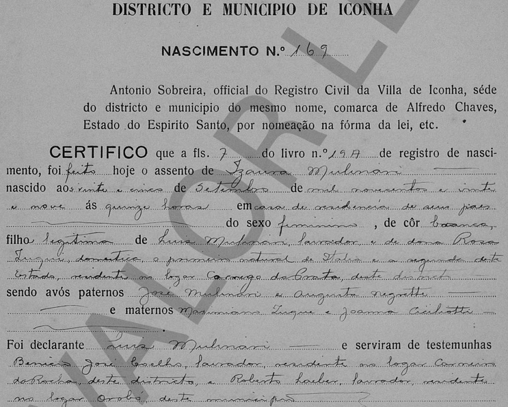 - Rosa Zuqui c.c. Luiz Molinari (natural da Itália), residentes no Corrego da Prata-ES, filho de Jose Molinari (Já falecido em (05/10/1932) e Augusta Negretti