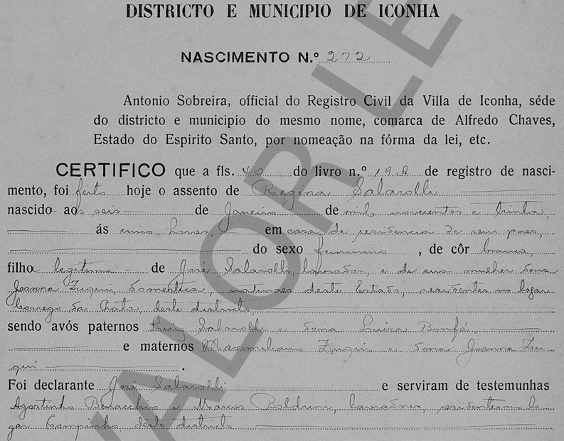 - Regina Salarolli (01/6/01/1930, às 5 horas, em Iconha-ES)