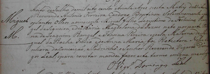 - Miguel (M), batizado no dia 08/07/1833, nas Mstriz de Vitoria-ES