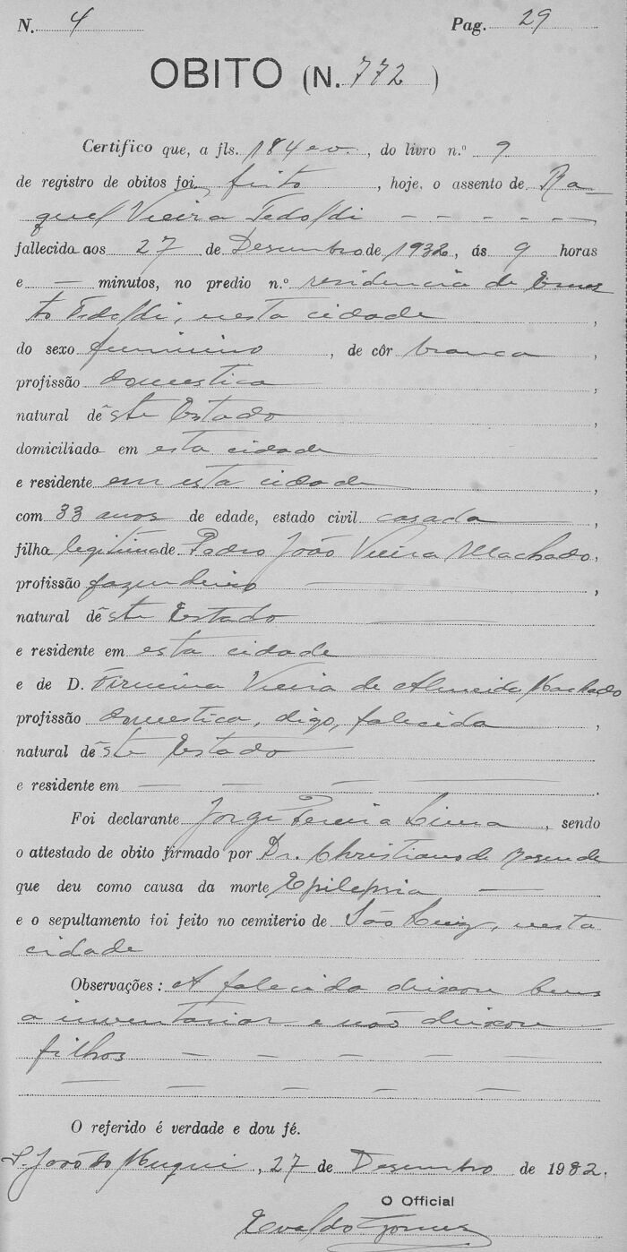 - Raquel Vieira Tedoldi, falecida no dia 27/12/1932, com 33 anos de idade, às