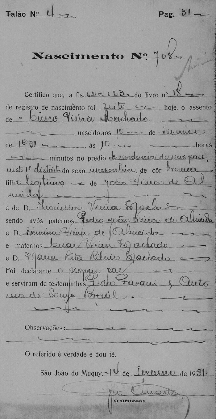- Cicero Vieira Machado, nascido no dia 10/02/1931, às 10horas, em Muqui-ES