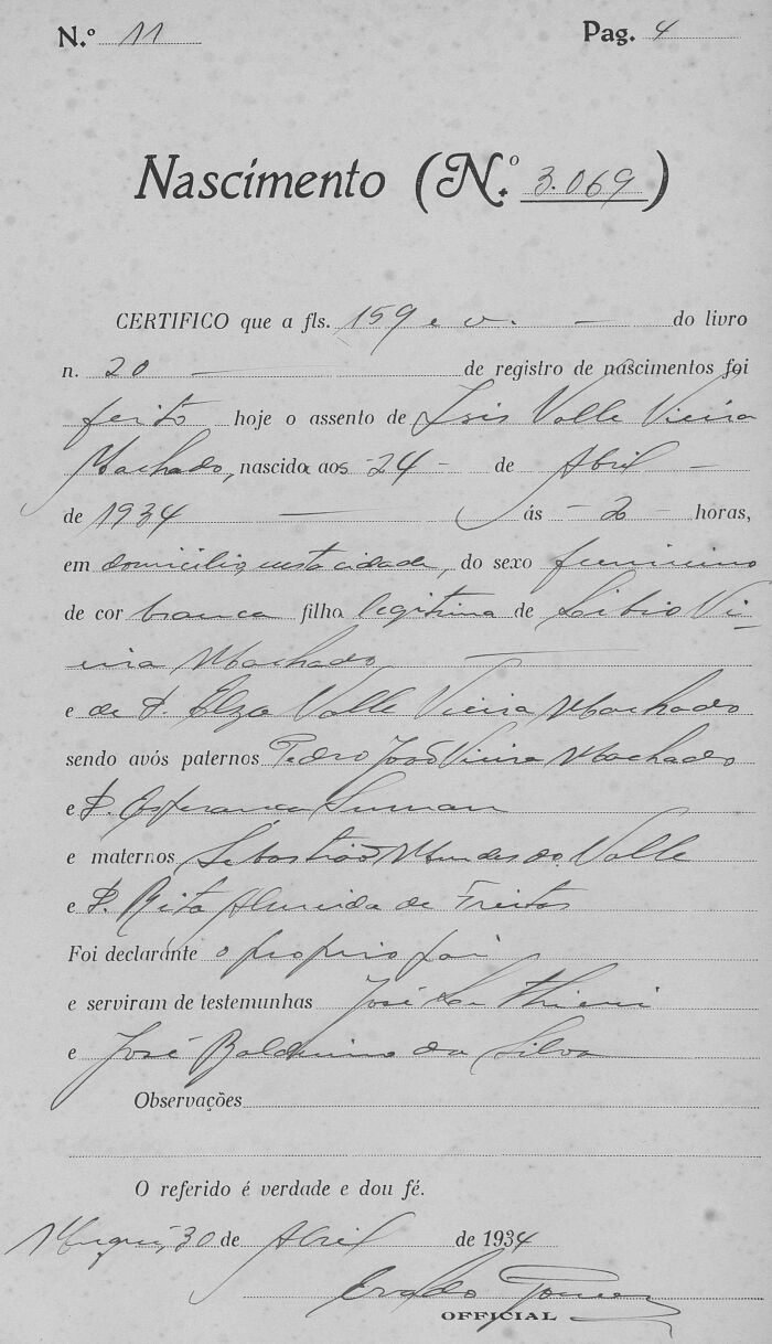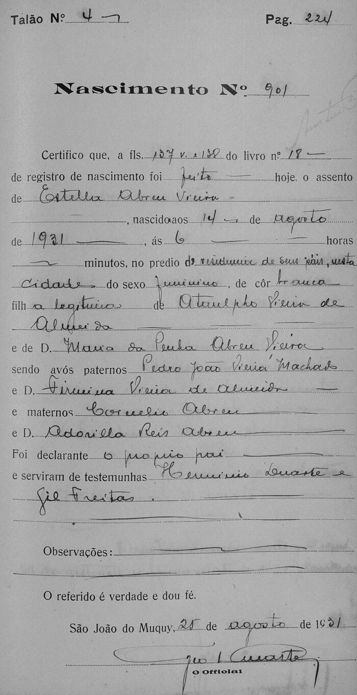 - Estella Abreu Vieira, nascida no dia 14/08/1931, às 6 horas, em Muqui-ES