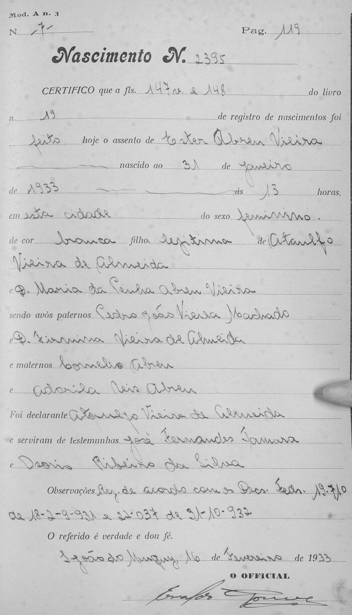 - Ester Abreu Vieira, nascida no dia 31/01/1933, às 13 horas, em Muqui-ES