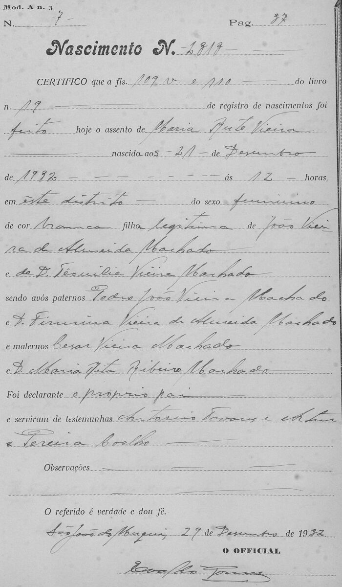 - Maria Rute Vieira, nascida no dia 21/12/1932, às 12 horas, em Muqui-ES