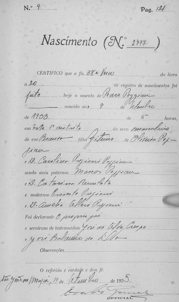 - Pedro Poggian, nascido no dia 04/09/1933, às 5horas, em Muqui-ES