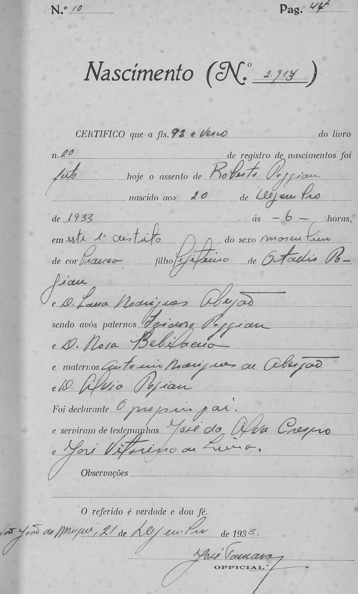 - Roberto Paggian, nascido no dia 20/12/1933, às 6horas, em Muqui-ES