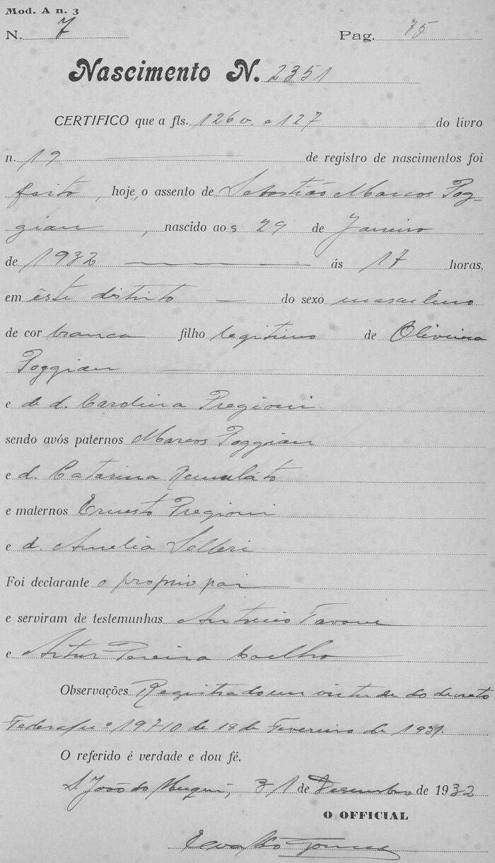 - Sebastião Marcos Poggian, nascido no dia 29/01/1932, às 17horas, em Muqui-ES
