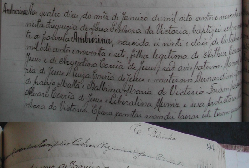 - Ambrosina, nascida no dia 22/10/1897, batizada no dia 04/01/1898, na Matriz de Vitoria-ES