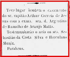 - Argentina Ramalho de Araujo Malta casou no ano de 1895 com Arthur Correia Jesus, filho de Manoel Correia de Jesus e Luiza Correia de Jesus