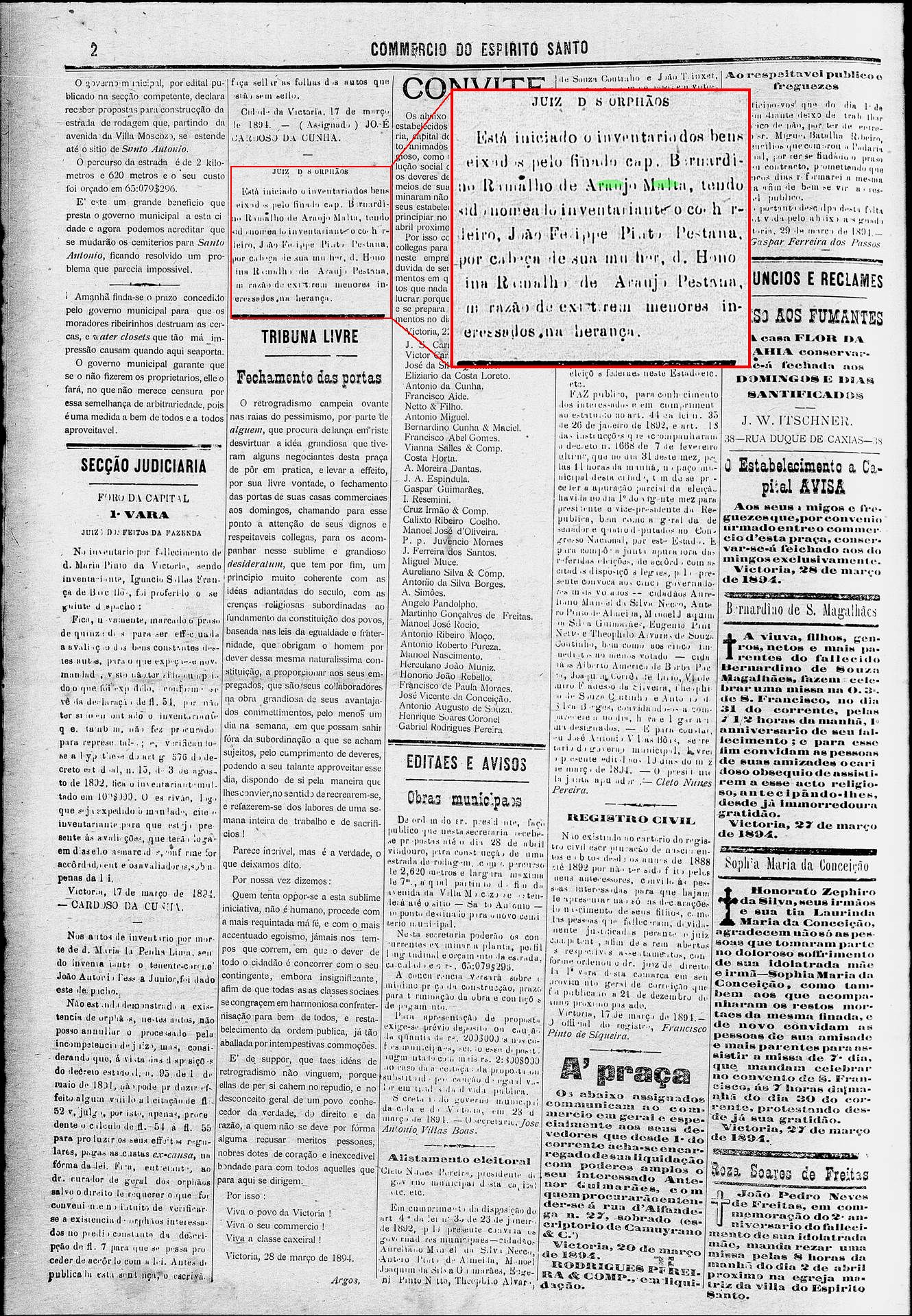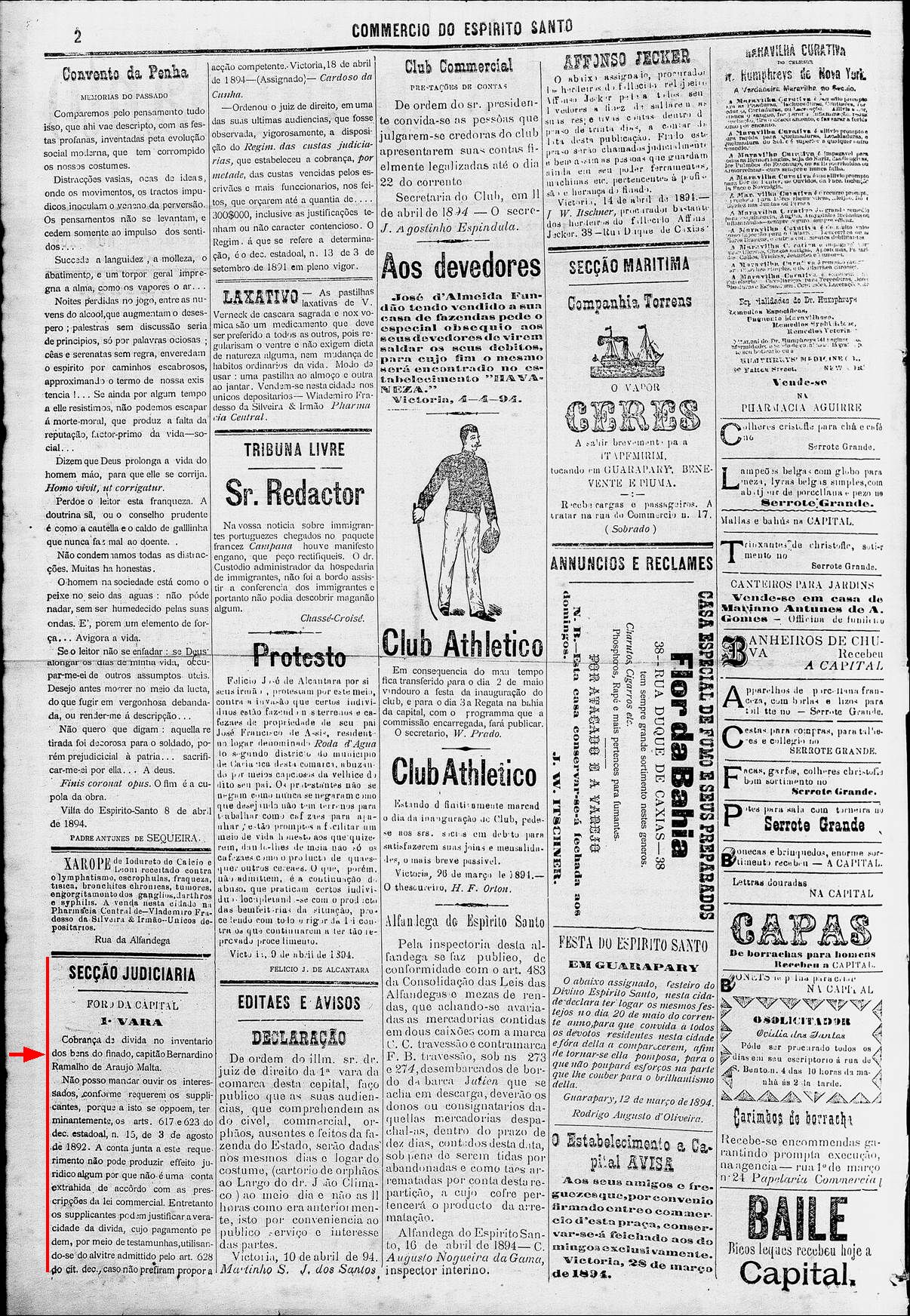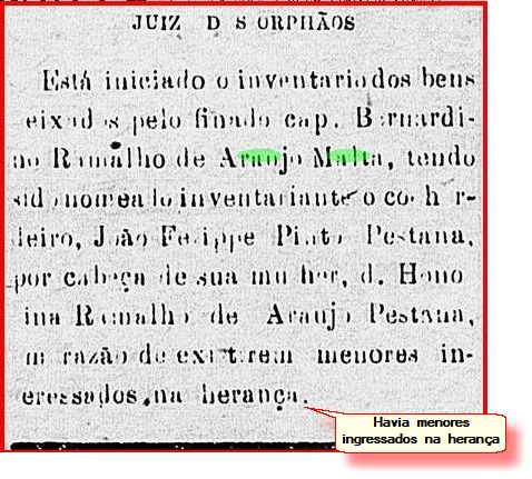 1894 - Falecimento de Bernardino Ramalho Araujo Malta - Herdeiros: Honorina Ramalhio de Araujo Pestana e João Felipje Pinto Pestana