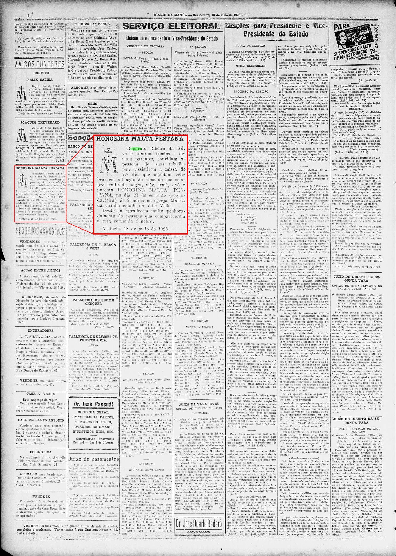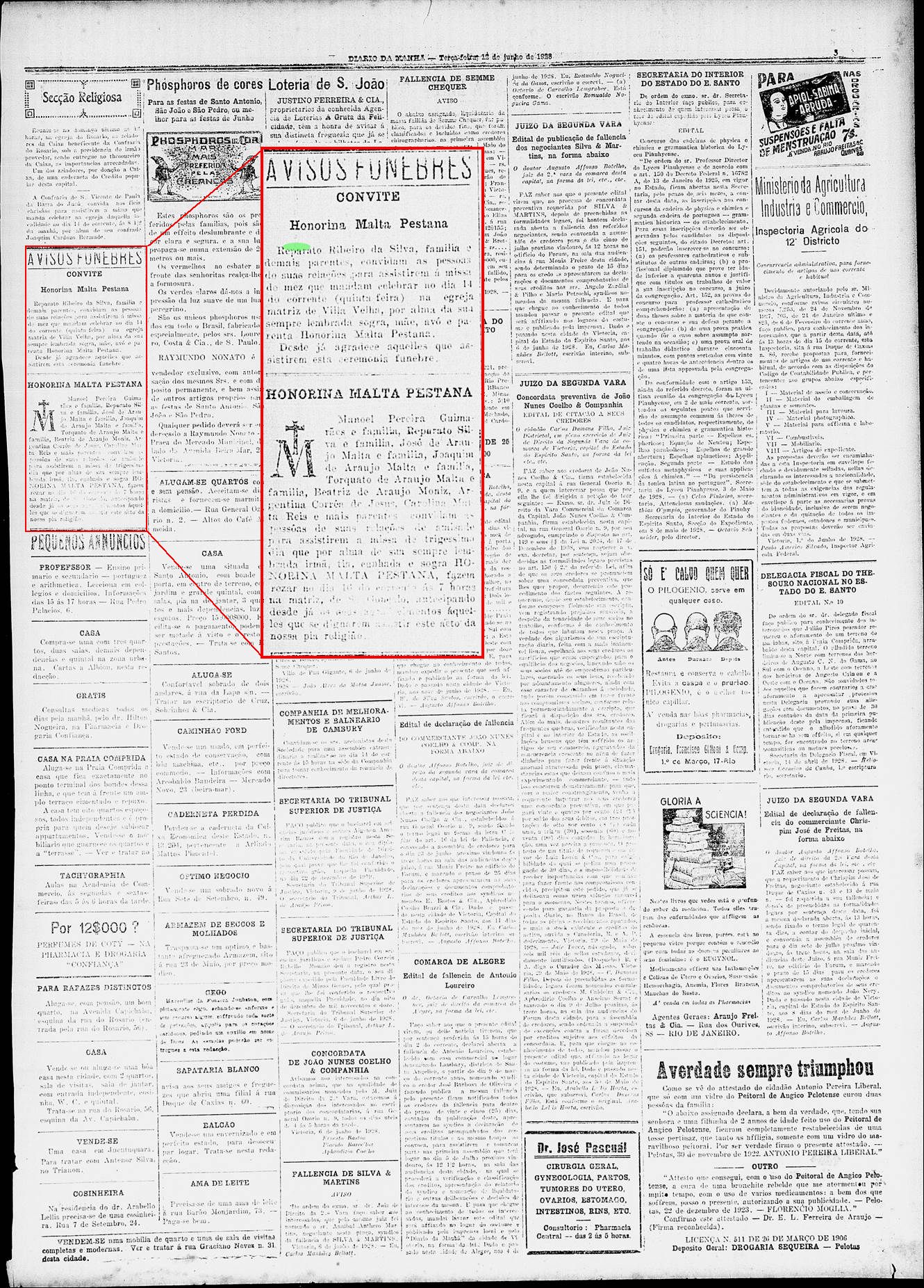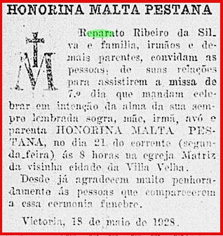 1928 - Falecimento de Honorina Malta Pestana, sogra de Reparato Ribeiro da Silva