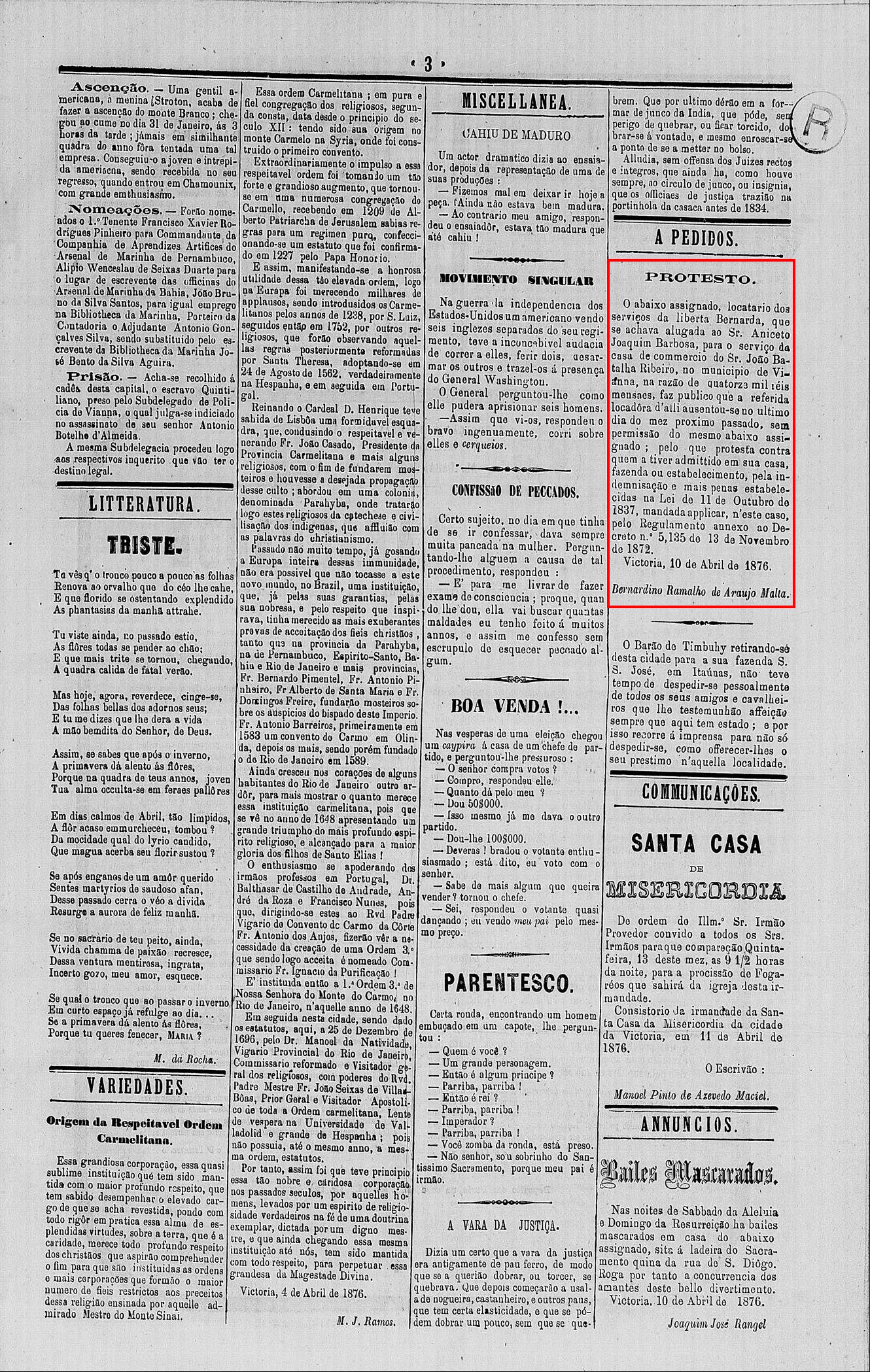 1876 - Protesto de Bernardino Ramalho Araujo Malta a respeirto dio aluguel da liberta Bernarda