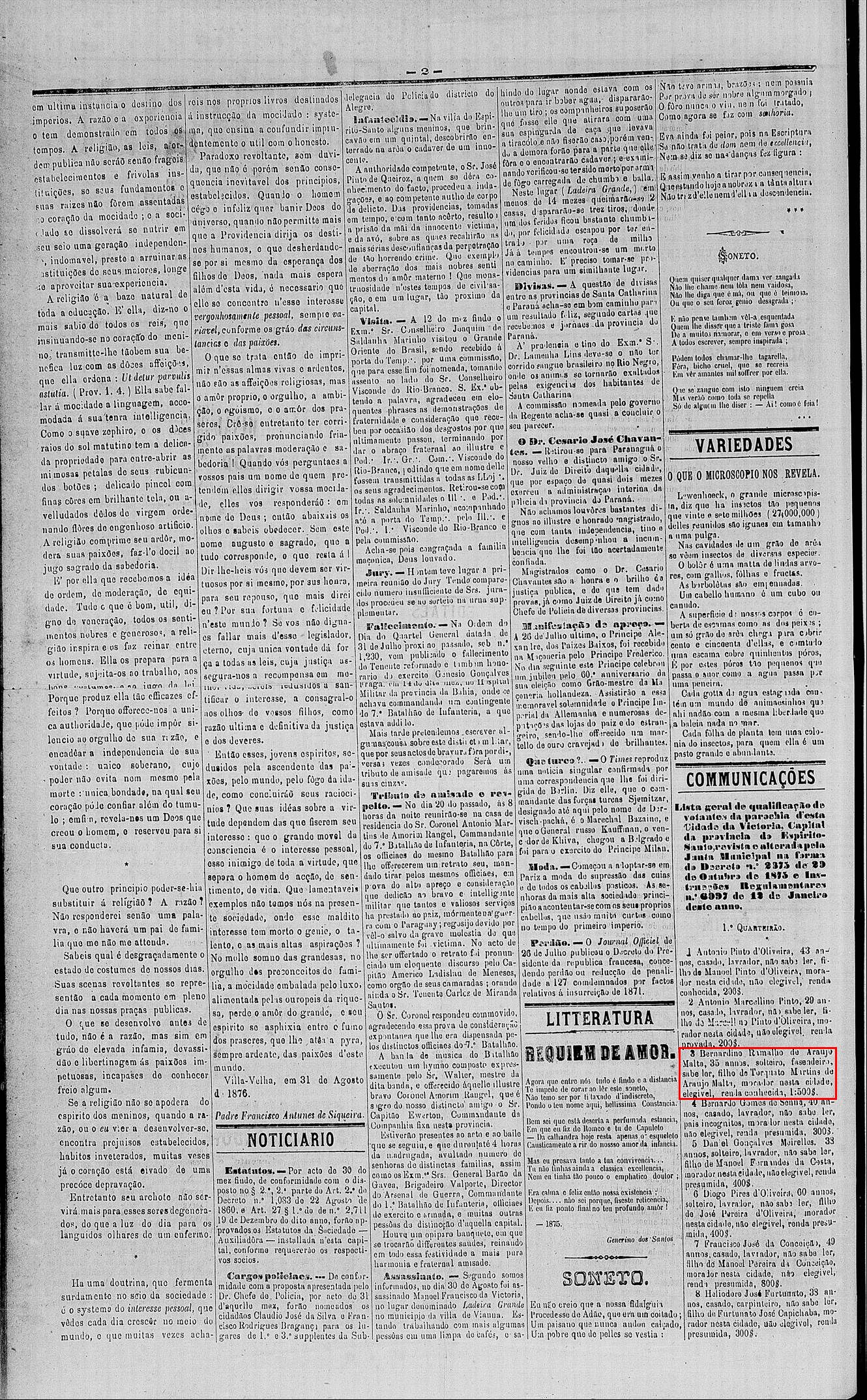 - Em 1876, conforme Lista de Eleitores qualificados para votar em Vitoria-ES. Bernardino Ramalho de Araujo Malta estava com 35, solteiro, fazendeiro, sabia ler, filho de Torquato Martins de Araujo Malta, renda conhecida 1500$ - Conforme jornal abaixo