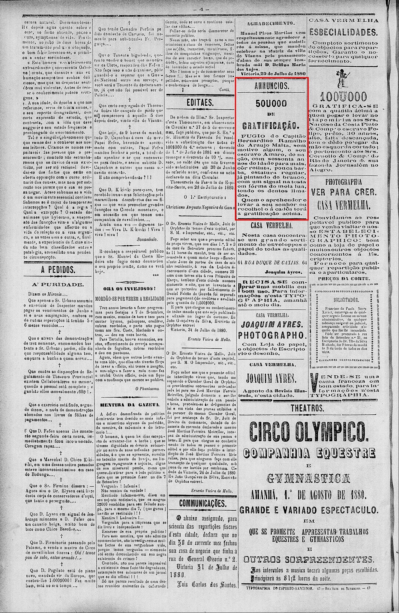 1880 - Recompensa para recapiturar escravo fugitivo de Bernardino Ramalho Araujo Malta