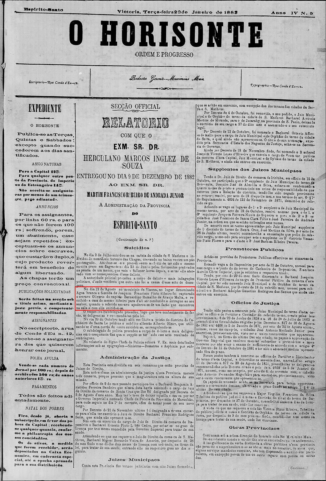 1883 - Escravo do Capitão Bernardino Ramalho de Araujo Malta, recapiturado em Viana-ES, na fazenda de Joaquim Francisco Pinto Ribeiro.