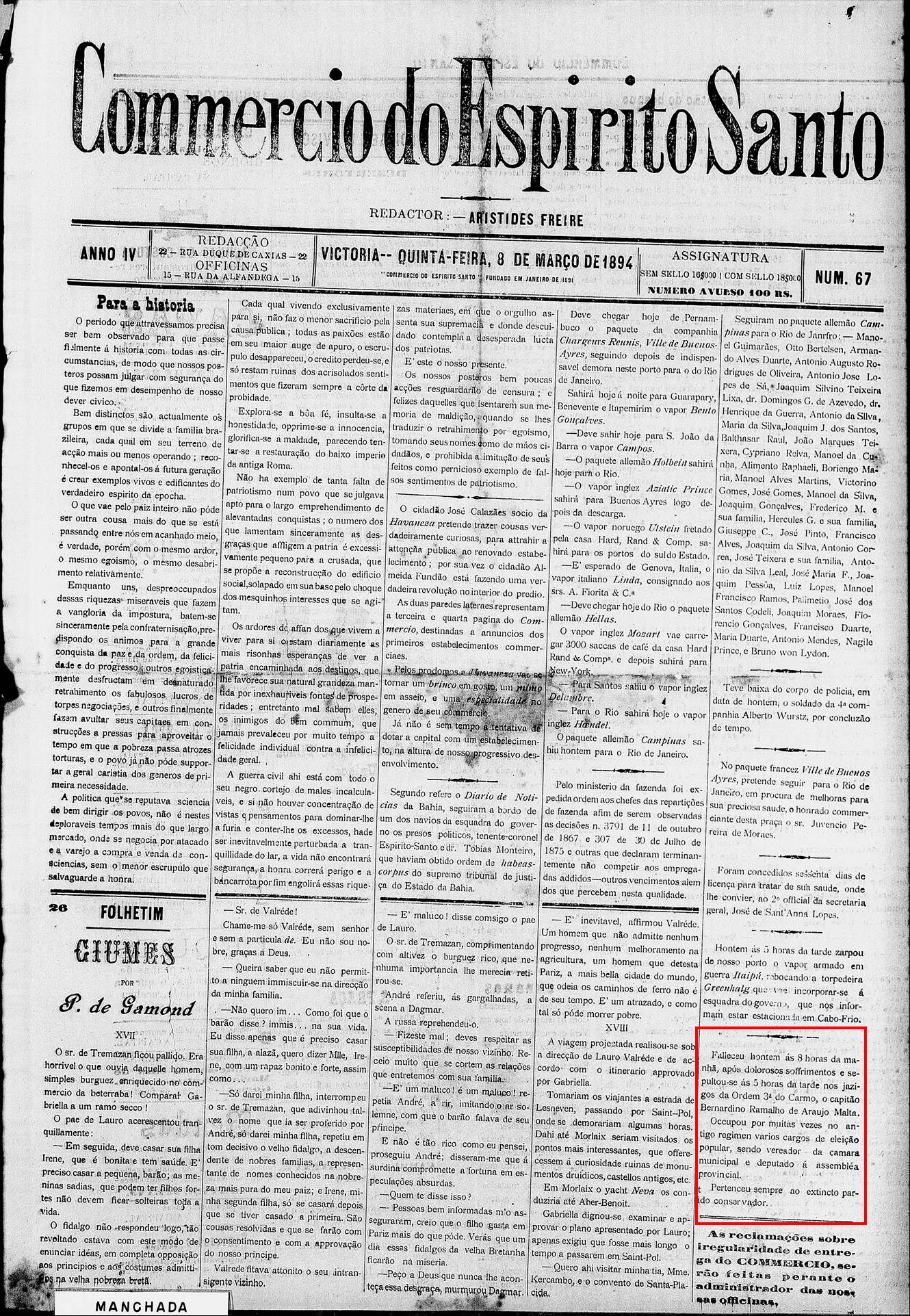- Faleceu no ano de 1894, conforme jornal abaixo.