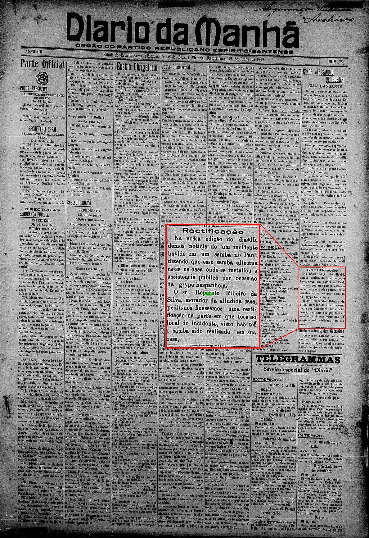1919 - Reparato Ribeiro da Silva - Retificação de notícia a respeito de samba na casa de Paul
