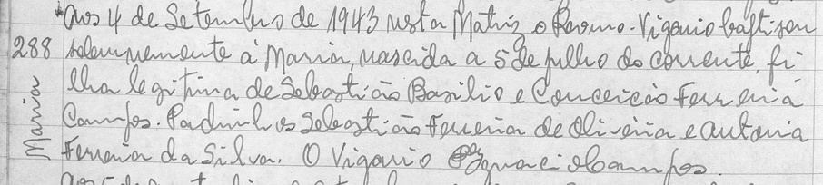 - Maria, nascida no dia 05/07/1943, batizada no dia 04/09/1943, em Bom Sucesso-MG