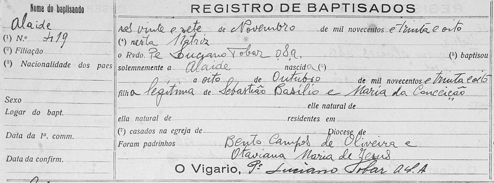- Alaide, nascida no dia 08/10/1938, batizada no dia 27/11/1938, em Bom Sucesso-MG