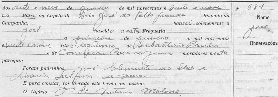 - Jose, nascido no dia 01/06/1929, batizado no dia 29/06/1929, na Capela de São Jose da Volta Grande - Guapé-MG