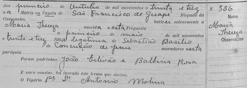 - Maria Tereza, nascida no dia 01/05/1933, batizada no dia 01/10/1933, na Capela de São Francisco de Guapé-MG