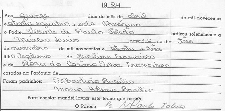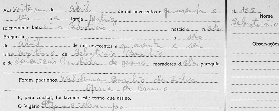 - Sebastião, nascido nop dia 06/04/1946, batizado no dia 21/04/1946, em Bom Sucesso-MG