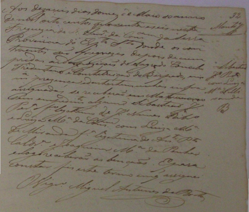 Casaram-se no dia 16/05/1846, na Freguezia de Nossa Senhora da Conceição da Serra-ES