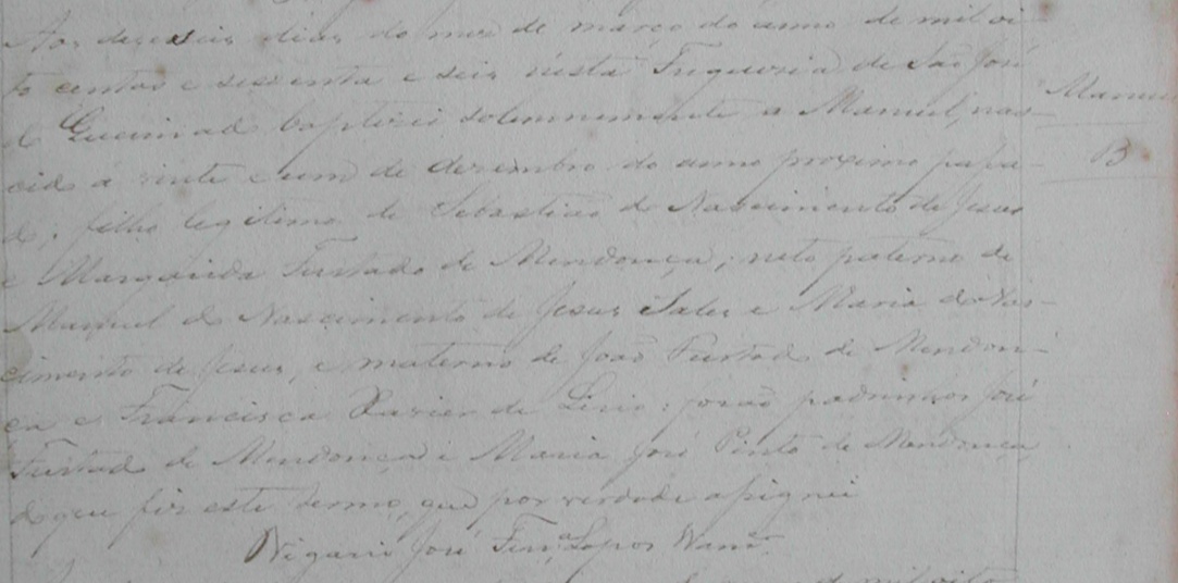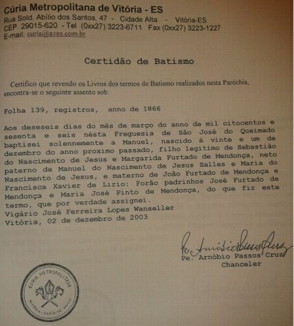 - Manoel, nascido no dia 21/12/1865, batizado n o dia 16/03/1866, em Queimados-ES