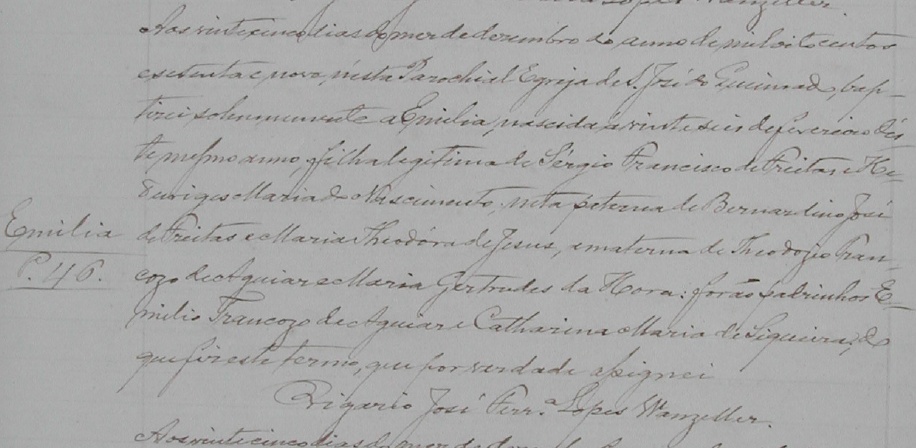 - Emilia, nascido no dia 26/02/1879, batizada no dia 20/12/1879, na Parochial Igreja de São Jose do Queimado-ES