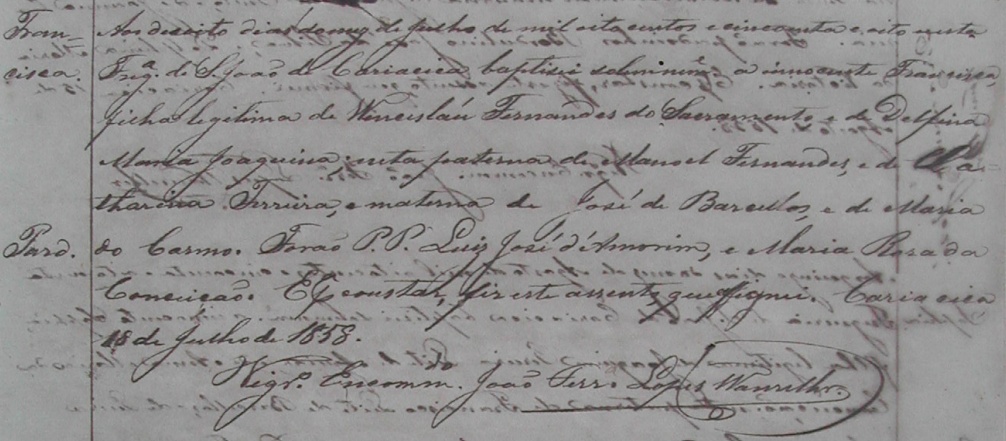 - Francisca, batizada no dia 18/07/1858, na Freguezia de São João de Cariacica-ES