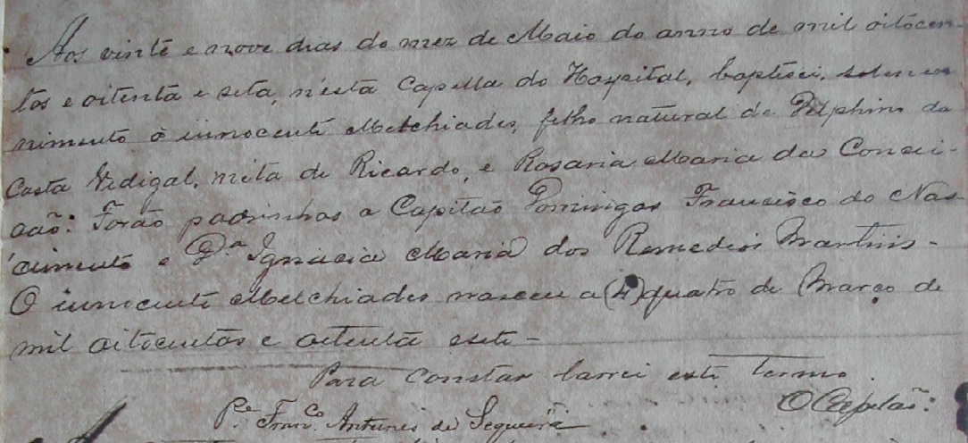 - Melchiades (Filho natural), nascido no dia 04/03/1887, batizado no dia 29/05/1887, na Capela da Santa Casa de Misericordia-ES
