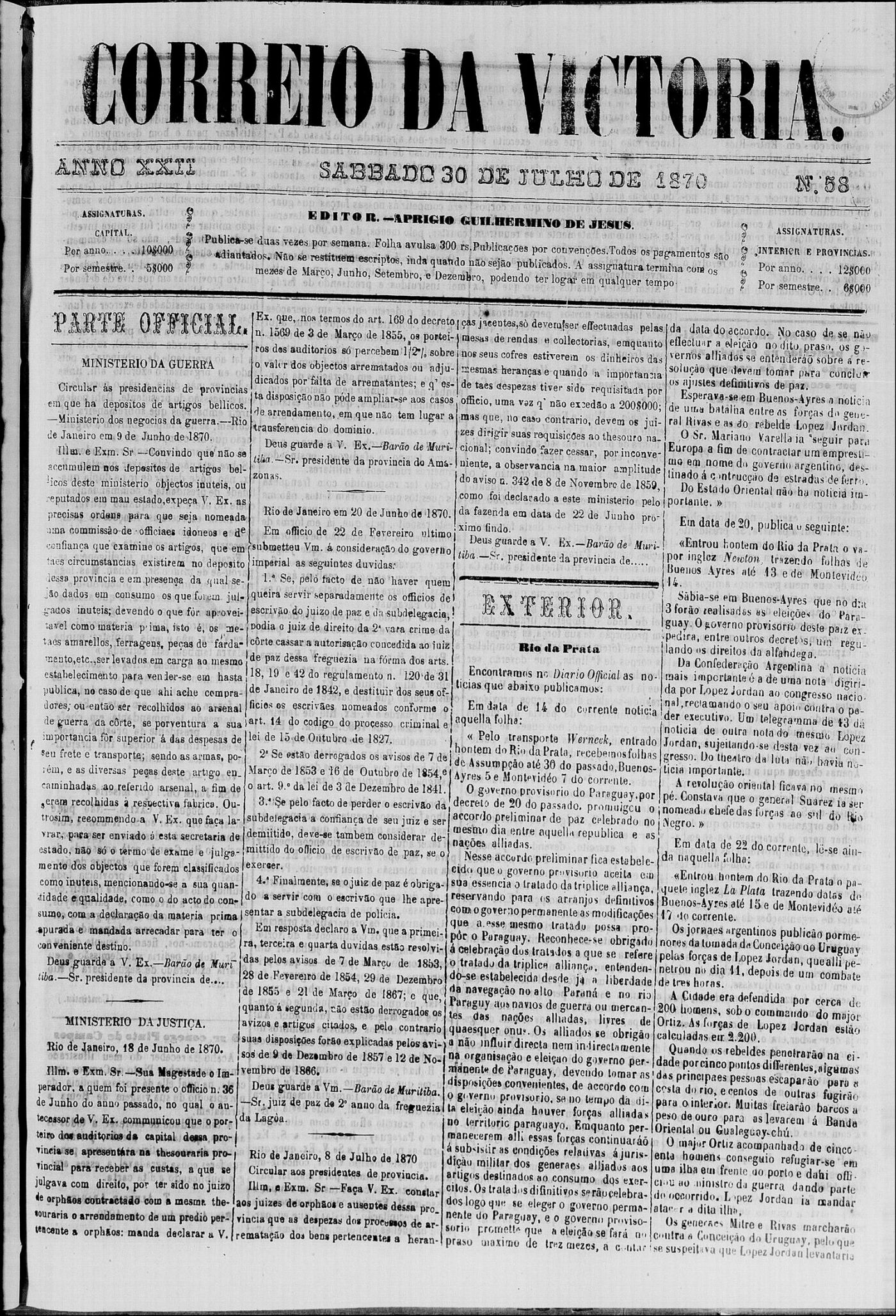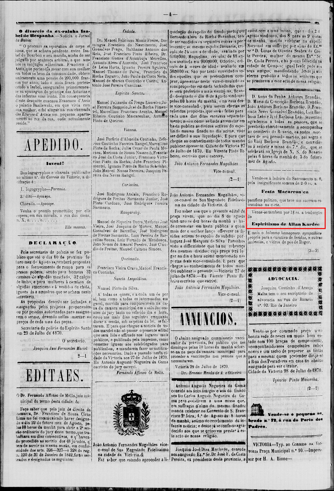 Curiosidade No Jornal "Correio da Victoria", do Estado do Espirito Santo, de 30 de Julho de 1870 (sábado), edição 58, página 4, localizamos o seguinte anúncio: "Vende-se também por 1$ rs a tradução do Espiritismo de Allan Kardec"
