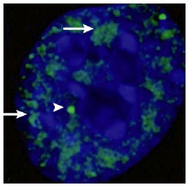 Ao nível de microscópio fluorescência - elas se apresentam como pontuações irregulares, que variam em tamanho e forma, e quando