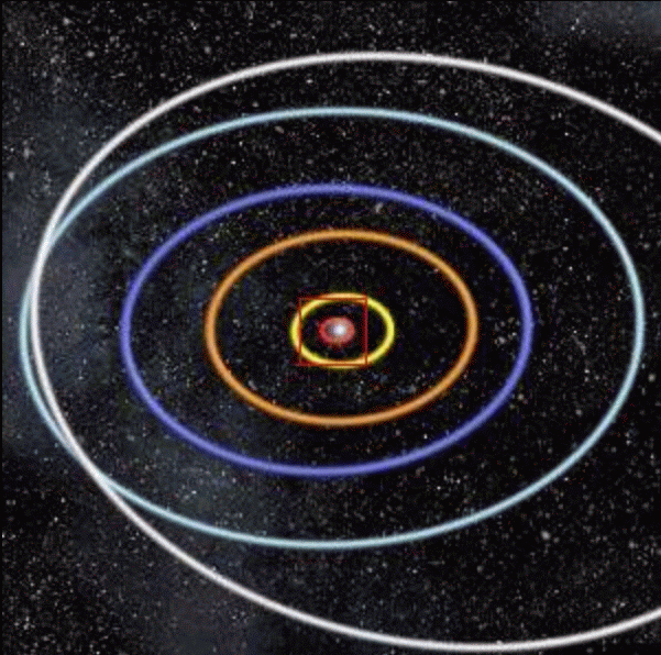 1 bilhão de quilômetros (1012m) - Órbitas de: Mercúrio, Vênus, Terra, Marte e Júpter: ![]() 100 milhões de quilômetros (1011m) - Órbita de Vênus, Terra e Marte: