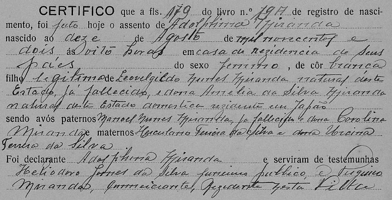 - Adolfina Miranda (branca, 10/08/1902, às 8 horas, em Iconha-ES)