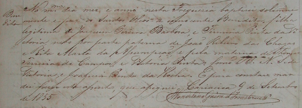 Benedita, batizada no dia 09091855, na Freguezia de Cariacica-ES