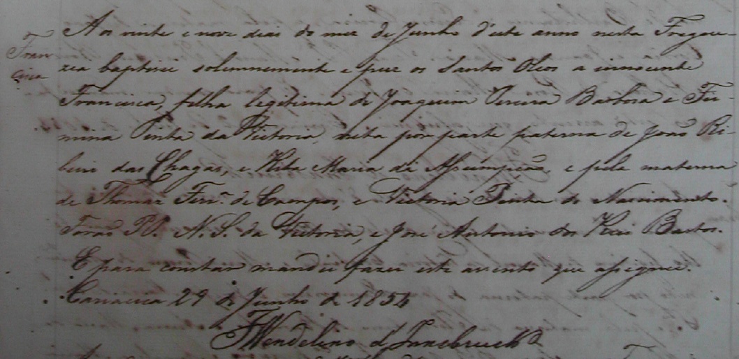 Francisca, batizada no dia 29/06/1854, na Freguezia de Cariacica-ES