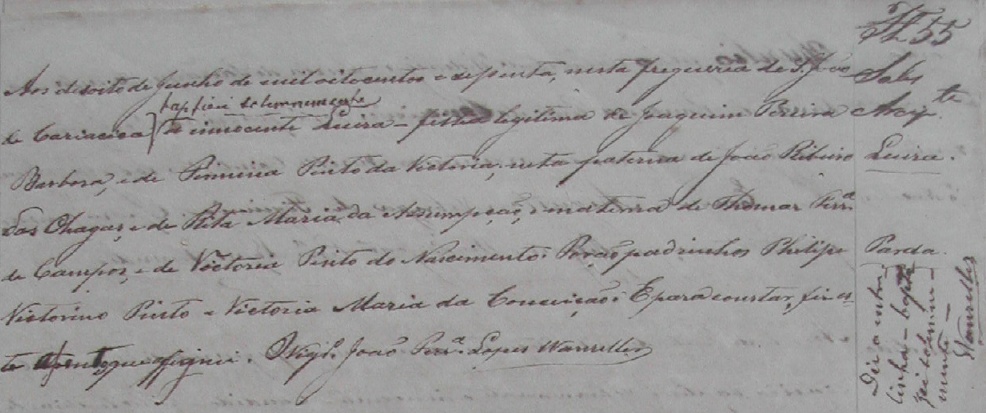 Padrinhos: Joaquim Pinto da Rocha e sua mulher Victoria Maria da Conceição