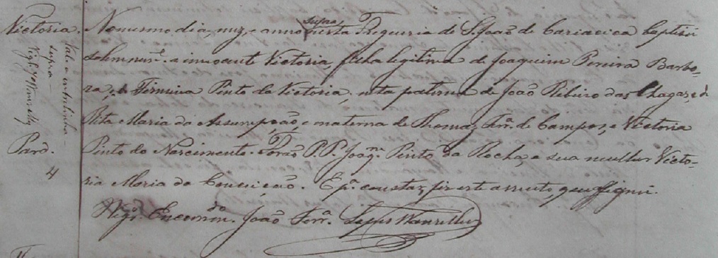 Victoria, batizada no dia 09/01/1859, na Freguezia de São João de Cariacica-ES