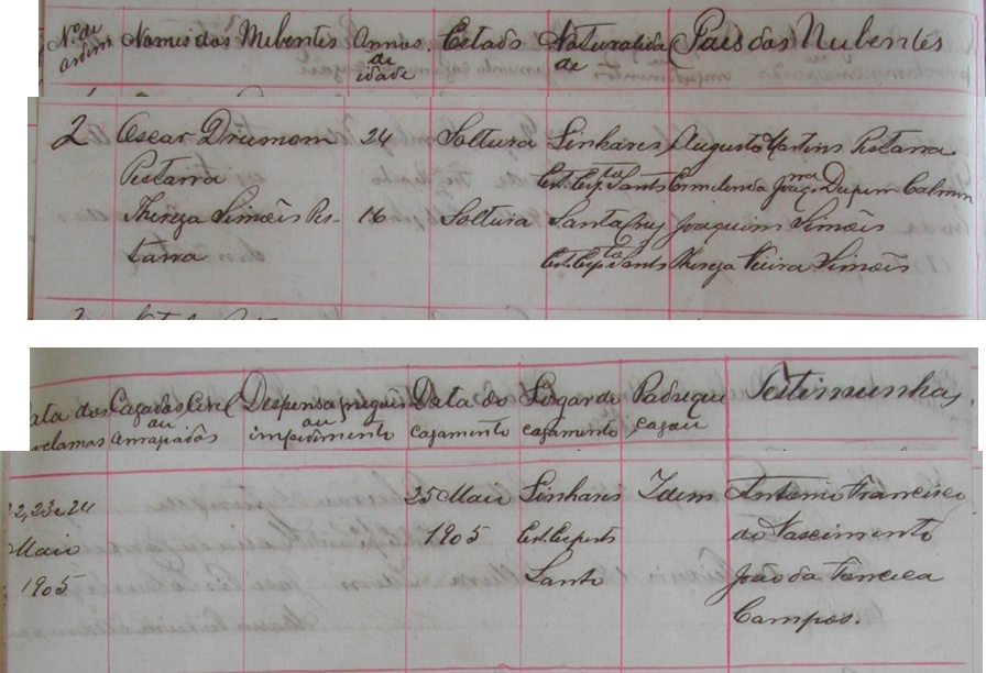 Ele com 24 anos de idade, viuvo de Maria da Silva Pinto, lavrador, natural da freguesia de Riacho e ela com 18 anos de idade, natural de Nova Almeida-ES