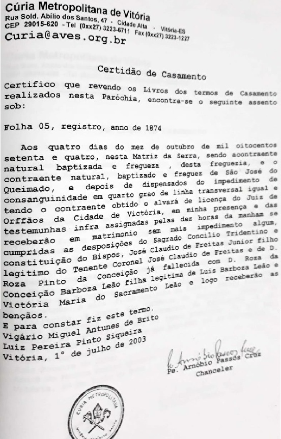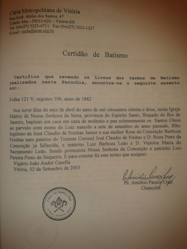 - Luiz - Batizado no dia 09/04/1882, na Matriz da Serra-ES, nascido no dia 07/09/1881