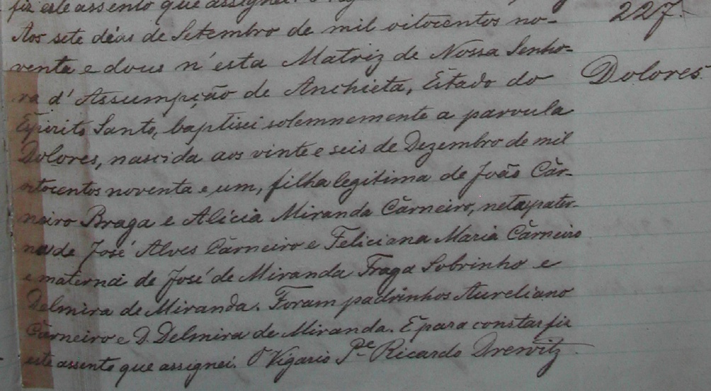 - Dolores, nascido no dia 26/12/1891, batizada no dia 07/09/1892, na Matriz de Nossa Senhora da Assumpção de Anchieta-ES