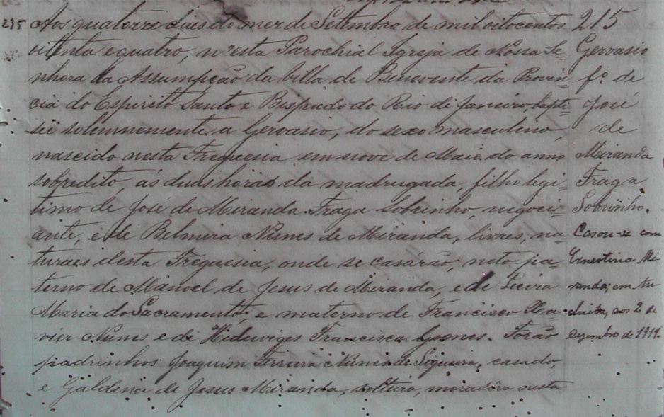 - Gervasio, nascido no dia 09/05/1884, batizado no dia 14/09/1884, na Parochial Igreja de Nossa Senhora da Assumpção da Vila de Benevente-ES