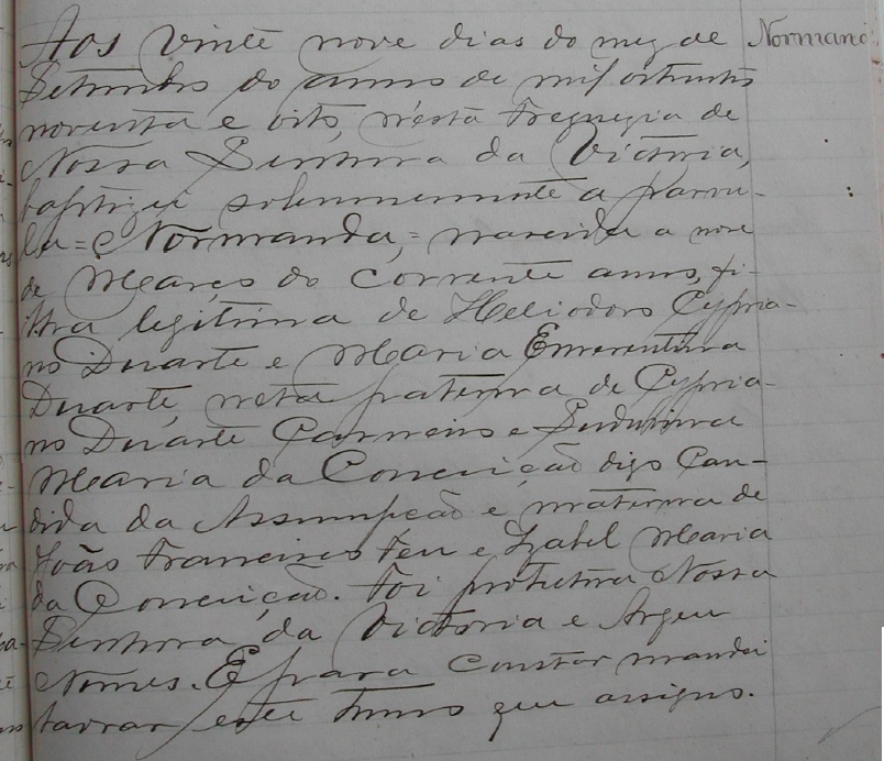 - Normanda, nascida no dia 09/03/1898, batizada no dia 29/09/1898, na Freguezia de Nossa Senhora da Vitoria-ES