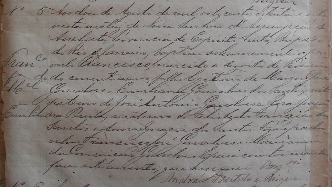Francisco, nascido no dia 18/02/1888, batizado no dia 12/08/1888, na matriz de Nossa Senhora da Assumpção de Anchieta-ES