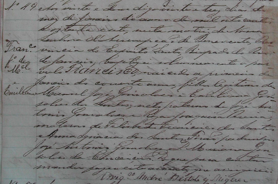 - Francisco, nascido no dia 01/01/1887, batizado no dia 23/01/1887, na Matriz de Nossa Senhora da Assumpção de Benevente-ES