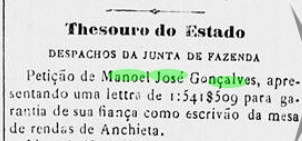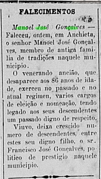 Parizio Jose Gonçalves, em 1929 foi substituido no cargo de Oficial do Registro Civil, por Manoel Jose Antunes